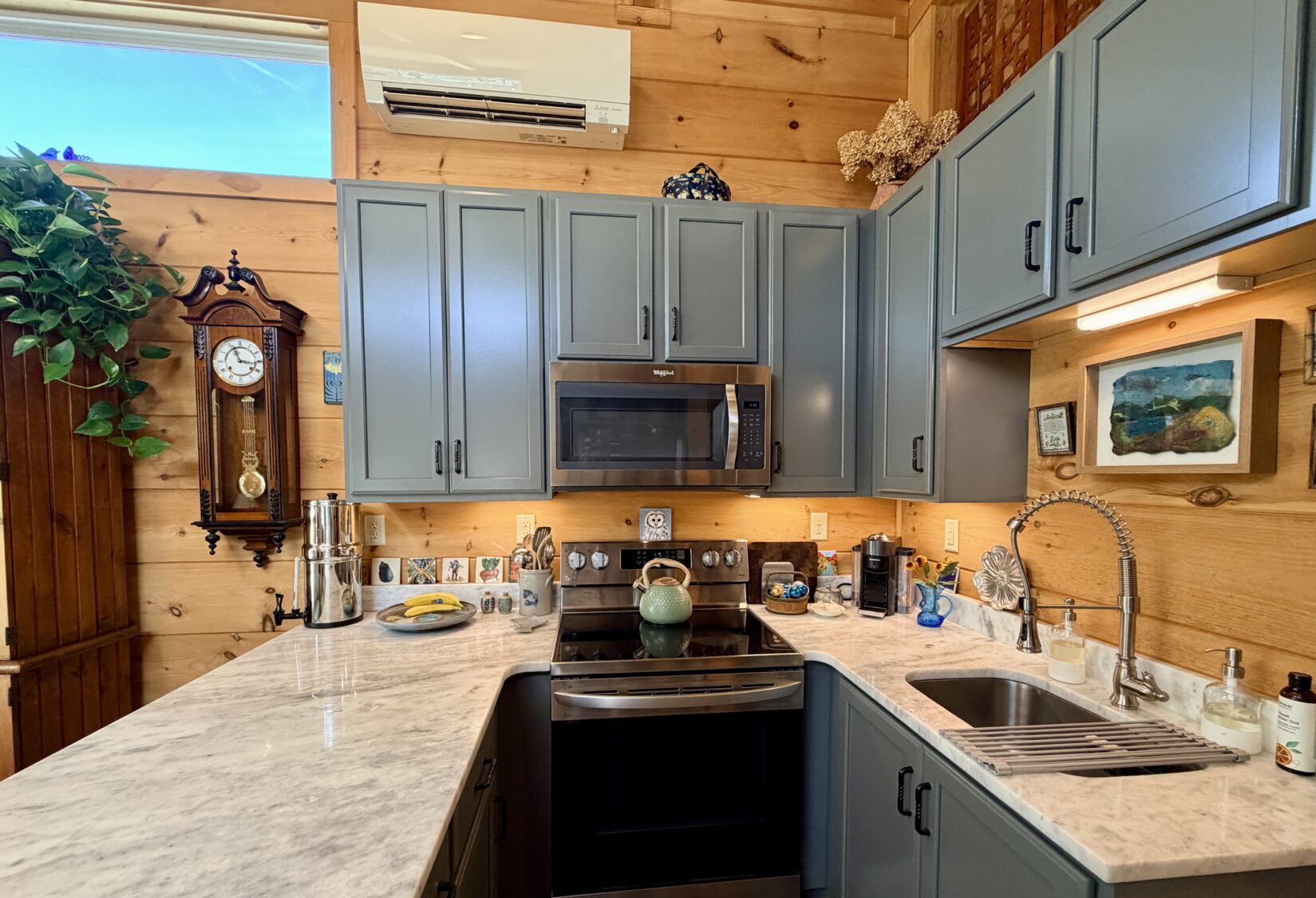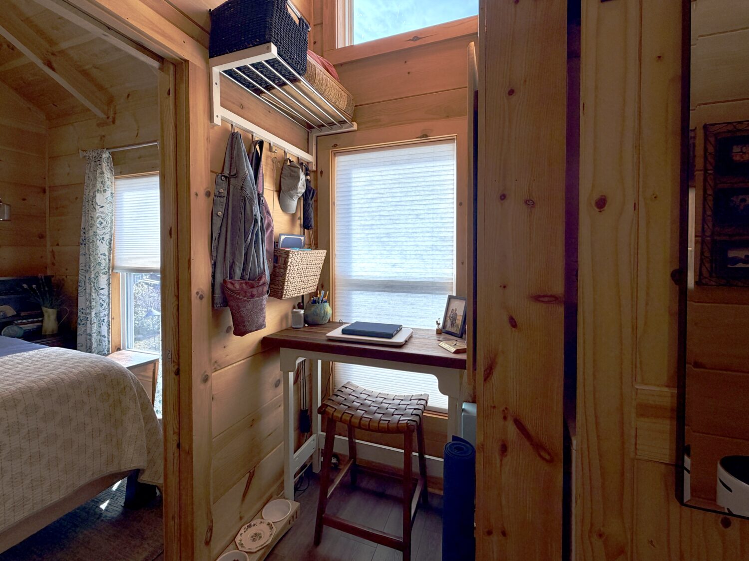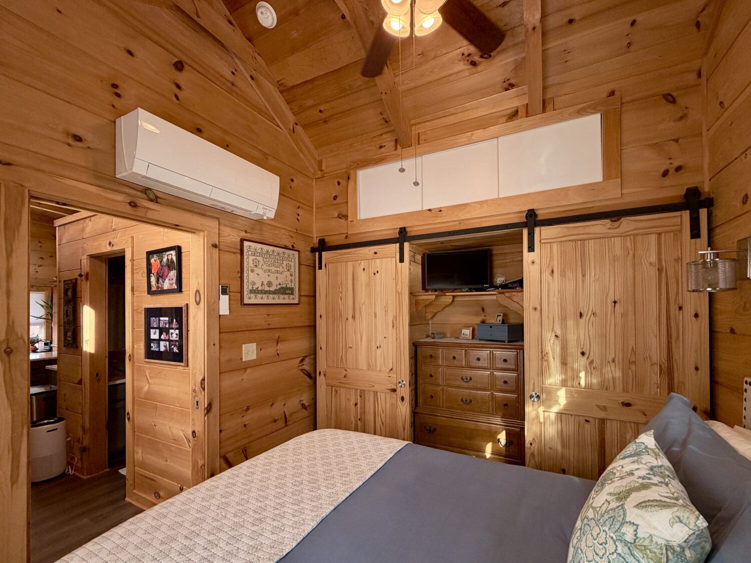 Discover comfort, efficiency, and beautiful design in this 1-bedroom, 1-bath tiny home situated on a desirable corner lot. Inside, the warm pinewood walls and ceilings create a cozy, cabin-like atmosphere, while the thoughtful layout includes a dedicated space for a desk or additional storage, making it easy to work from home or stay organized.