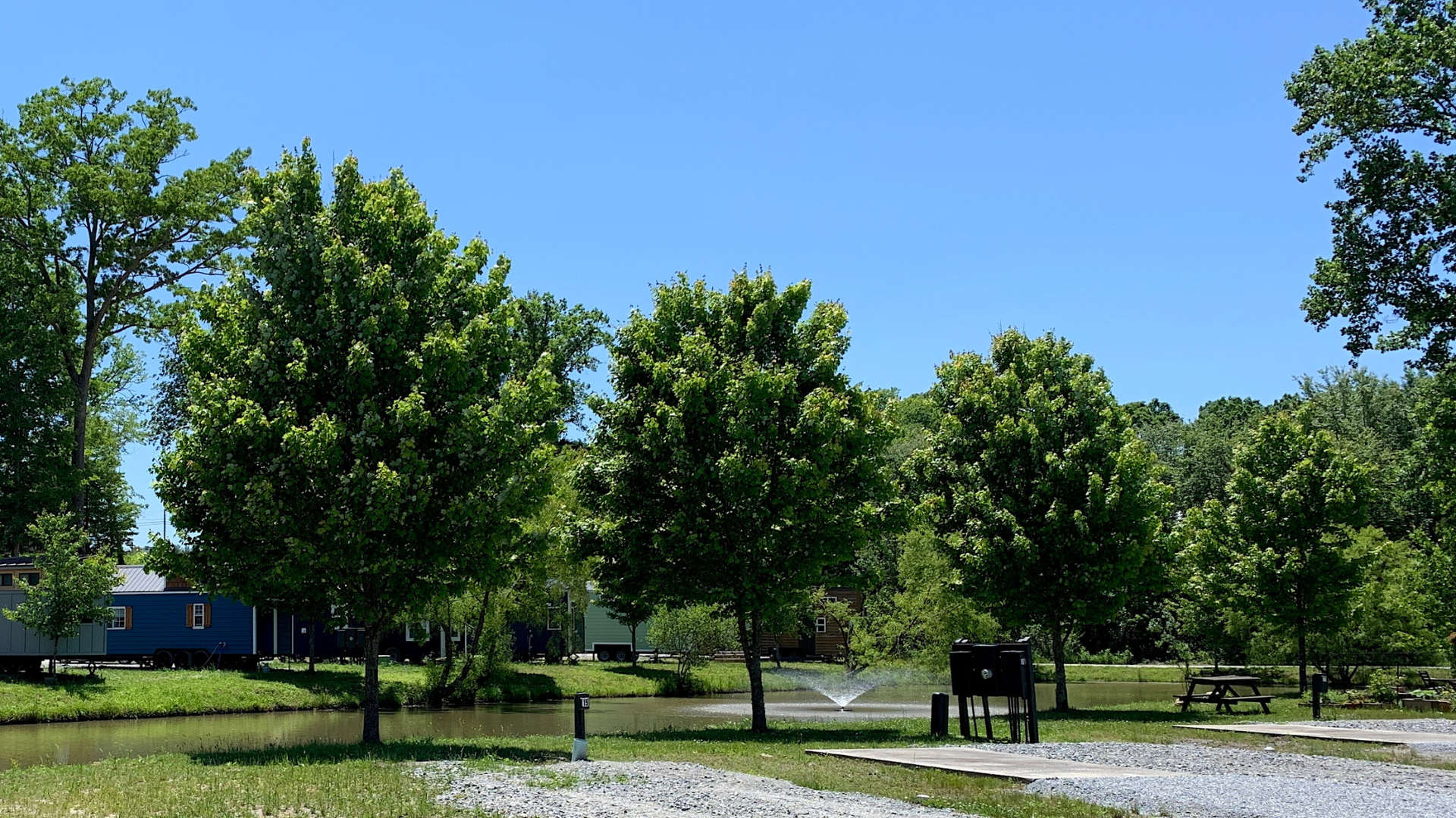 The Meadows’ homesites are thoughtfully arranged along a well-maintained paved road encircling a serene pond. Each lot for rent is tailored for the mobile homeowner, providing ample space for a tiny towable, RV, or fifth wheel. This extended-stay park also offers parking facilities, and a gravel path.